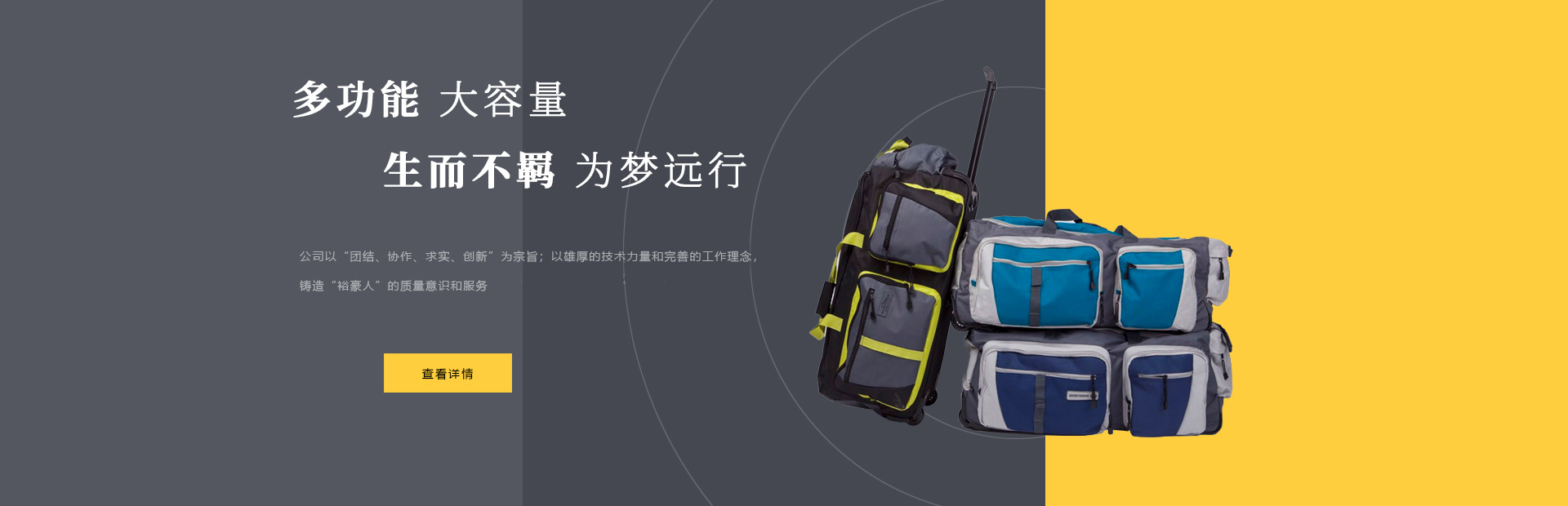 本公司是一家集設計,制造,加工,貿(mào)易為一體的專業(yè)箱包生產(chǎn)出口企業(yè)。已有20多年箱包生產(chǎn)經(jīng)驗。公司廠區(qū)位于中國浙江省海寧市鹽官工業(yè)園區(qū),占地15000平方米,建筑面積10000平方米,員工150人,年生產(chǎn)能力260萬只(套)。 公司以尼龍,滌淪,牛津布,P...